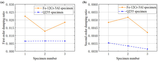The same test method was used to determine the damping ratios of specimen 2 and specimen 3 and the damping ratio of the Q235 carbon steel specimens, and the test results are summarised in Table 2. The comparison results of the test are shown in Figure 10. “The large deviation in the test results for the Fe-12Cr-3Al specimen 2 can be attributed to the homogeneity of the specimen material, the tightness of the specimen mounting, and the quality of the sensor mounting. It should be especially pointed out that the high damping characteristics of Fe-12Cr-3Al are realised by its own crystal structure, and a poor crystal structure will greatly affect its damping characteristics, which may lead to a large deviation of the damping ratio, so the homogeneity of the specimen material itself is the main influence on the test error. In this paper, the influence of other factors is reduced by testing several times and then taking the average value as the final reference value. According to the average value of the three specimens’ test results, the first-order and second-order damping ratios of Fe-12Cr-3Al alloy are 2.75 and 1.42 times higher than those of Q235 carbon steel, respectively. It can be determined that the overall damping characteristic of the Fe-12Cr-3Al alloy is significantly better than that of Q235 carbon steel.” When the excitation amplitude is fixed, the damping parameter of the Fe-12Cr-3Al alloy decreases with increasing frequency. The results obtained from the test provide a real and reliable database for the subsequent finite element calculation and vibration reduction analysis.