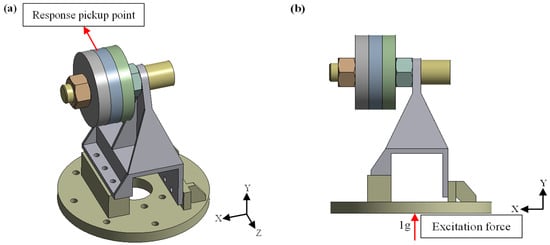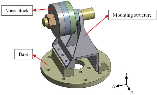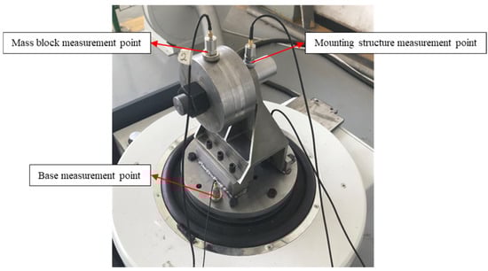 Design and machine a solid prototype based on the fixture model in Section 3. In the fixture system, the mass block is used to simulate the mass loading of the lubricating oil tank and is bolted to the mounting structure, and the mounting structure is bolted to the base simultaneously. The integral mounting structure is fixed on a vertical vibration test rig. Three measurement points were set up in the test, namely the mass block measurement point, the mounting structure measurement point, and the base measurement point, as shown in Figure 18.