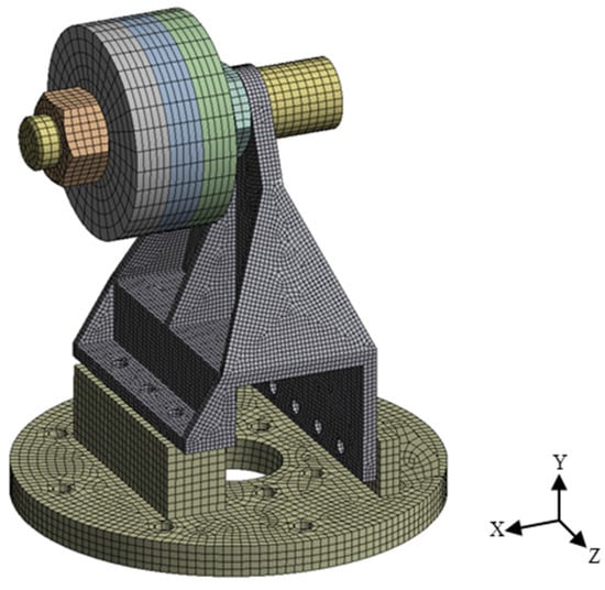 The ANSYS software (The version number of the software is: ANSYS 2023 R1) is utilised to mesh the model and set the boundary condition, and the mesh result is shown in Figure 13. Where the mass blocks use the sweep method, and the remaining parts use the hex dominant method. The mesh of the mounting structure was encrypted as it was the main study component. The body sizing value of the mounting structure is 2.5 mm, and the body sizing value of other parts is 5 mm. The model includes a total of 262,244 nodes and 63,465 elements, with good mesh quality. All contact regions are set as bonded type, and the bottom surface of the base is set as a fixed support surface. In addition, using the Adaptive Convergence function in ANSYS, we performed adaptive mesh refinement based on the solution results to check the convergence of the results [22]. This was done by setting different mesh densities and observing the changes in the solution results until the results stabilised, thus ensuring the convergence and reliability of the analysis results.