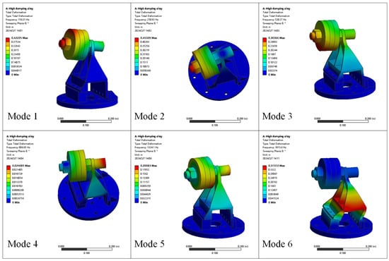 The dynamic characteristics of the high damping alloy material and the carbon steel material mounting structures are calculated using ANSYS software, and the modal frequency comparisons are shown in Table 4. The first 6 orders of vibration patterns of the high damping alloy material and the carbon steel mounting structure are shown in Figure 14 and Figure 15, respectively.