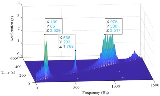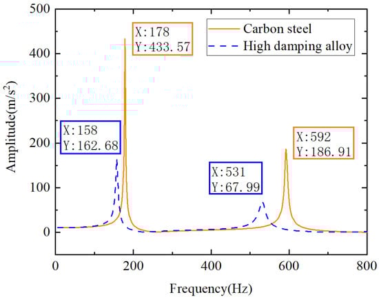 From Table 5, it can be seen that in the range of 0–1500 Hz, the modal frequency of the high damping alloy material mounting structure is comparable to that of the carbon steel material mounting structure, but there is a significant reduction in the vibration response amplitude, and the reduction rate of the vibration amplitude of the corresponding order can reach 60%, respectively.