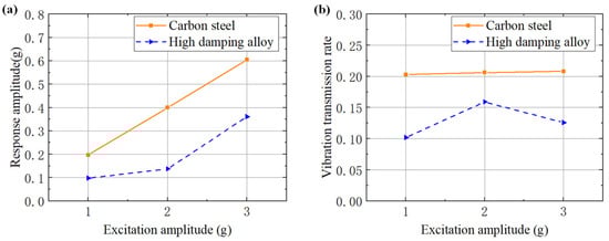 According to the fixed-frequency test results of mounting structures and comparing the high damping alloy material mounting structure with the carbon steel material mounting structure, there is a reduction in the vibration response at the mass block, and the reduction rate is close to 50%. The transmission rates of the carbon steel material and the high damping alloy material mounting structures are maintained at about 0.2 and 0.12, respectively. The transmission rate at different excitation amplitudes can be reduced by up to 49.8%, 22.8%, and 39.4%, respectively. In addition, a comparative analysis of the vibration response of the base and the mounting structure shows that the best damping effect of the high damping alloy material mounting structure occurs at an excitation amplitude of 2 g, which may be attributed to the nonlinear performance of the high damping material.