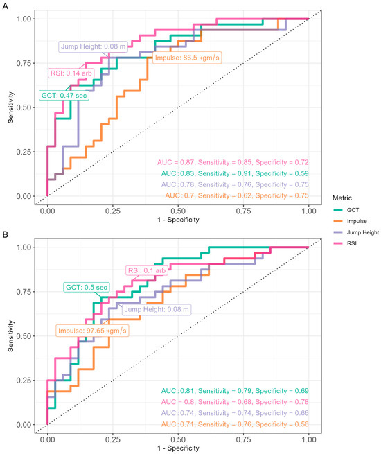 Receiver–operator characteristic (ROC) curve results for RSI, jump height, and jump momentum. (A) shows the pre-intervention results; (B) shows the post-intervention results. The optimal threshold for each metric is shown for reference. Note: AUC = area under the curve; RSI = reactive strength index; GCT = ground contact time.