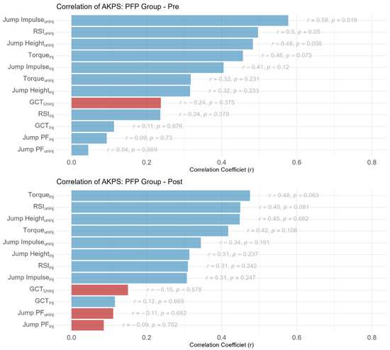 Correlation results between kinetic and kinematic parameters and the AKPS for the PFP group. Top panel shows the correlations between metrics prior to the intervention; bottom panel shows the correlations between post-intervention metrics. Note: PFP = patellofemoral pain; AKPS = anterior knee pain scale; inj = injured limb; uninj = uninjured limb; RSI = reactive strength index; GCT = ground contact time; blue bars indicates positive correlation; red bars indicate negative correlations.