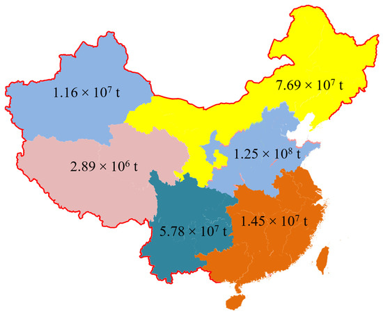 Maize is an important crop cultivated in 29 provinces in China [37]. The total yield of maize in China was up to 2.89 × 108 t in 2022, and the yields of different producing regions are shown in Figure 1. Maize grows rapidly and its wide leaves provide a large light shielding layer. In addition, the agronomical ploughing used in maize cultivation was also advantageous in reducing the weeds of the soil seed bank [38]. Compared to grasses, crops demonstrated a greater economic benefit in invaded land and did not introduce the potential risks of other weeds [39]. Thus, maize competed with invasive weeds as an alternative plant. In addition, maize, as one of the most important food crops, plays a significant role in human society and life. For example, maize is perceived as a foodstuff capable of sustaining a considerable number of individuals, particularly in developing countries. In developed countries, maize is regarded as forage in graziery and as a source material for biorefineries such as producing ethanol in industry.