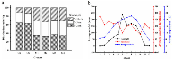 (a) Depth distribution of Eupatorium adenophorum seeds in different groups. (b) Monthly average rainfall, sunshine duration and air temperature of Xichang in 2017.