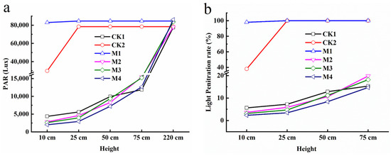 (a) PAR and (b) light penetration rate at different height in six field treatments.
