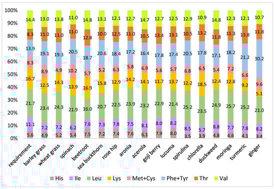 Figure 2 presents the distribution of essential amino acids in the samples in comparison with the reference protein [41]. The more similar the relative composition of amino acids to the human requirement, the better the quality. The essential amino acid present in the lowest ratio in a protein relative to the reference protein is referred to as the limiting amino acid. Plant foods are generally deficient in certain amino acids, mostly in methionine and/or lysine. Proteins that contain high amounts of these amino acids can be effectively used to complement plant proteins, to obtain foods with a higher nutritional quality [42]. In general, our samples were deficient in valine, sulfur-containing amino acids (methionine, cysteine), lysine, and isoleucine. On the other hand, threonine, aromatic amino acids (phenylalanine, tyrosine), and leucine were generally abundant. Most samples contained histidine in lower ratios compared to the reference protein, except for powders of beetroot and fruits. Considering all essential amino acids, acerola powder corresponded the most to the reference protein, whereas ginger powder showed the greatest deviation. Based on our calculations, lysine appeared to be the limiting amino acid in eight samples, namely in barley grass, rosehip, goji berry, spirulina, duckweed, turmeric, ginger, and moringa powders. Ginger powder was exceptionally poor in this amino acid. The ratio of lysine to total essential amino acids was ap-proximately three times lower in this product compared to the reference protein. Isoleucine was also a frequent limiting amino acid. It was present at the lowest relative ratios in the wheat grass, spinach, sea buckthorn, aronia, acerola, lucuma, and chlorella powders. In beetroot powder, leucin was identified as the limiting amino acid. Chlorella powder contained a high concentration and ratio of lysine; thus, this product would be an effective functional ingredient for enhancing the amino acid profile of cereal-based products. On the other hand, spinach, another protein-rich nutraceutical, contained a relatively high ratio of sulfur-containing amino acids; thus, it may be a potential functional ingredient of legume-based foods.