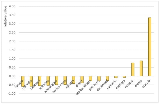 Among the antioxidant capacity tests, the CUPRAC assay resulted in the highest values, followed by the DPPH, FRAP, and TEAC assays. These variances are attributed to the fact that these tests are based on different mechanisms and are sensitive to different types of antioxidants. To obtain a more comprehensive parameter applicable to evaluate the relative antioxidant potential of different samples, the relative antioxidant capacity index (RACI) has been proposed, which standardizes the results of different antioxidant capacity assays, thus providing a more accurate ranking of samples [32]. This approach has been applied to a wide range of food categories, such as fruit and vegetable juices [46], teas and herbal infusions [47], coffees [48], black soybeans [49], and bee pollens [50]. Several studies show that the so-called “superfoods” typically have a high antioxidant potential [51]; however, limited information is available on the relative antioxidant capacity of superfood powders originating from different food groups. Figure 3 shows the relative antioxidant capacity indexes (RACIs) of our samples, calculated according to the method proposed by Sun and Tanumihardjo [32], taking into account the results of the four assays weighed equally. The RACIs of the powders were between −0.59 and +3.34. Among the fourteen samples, only acerola, aronia, and rosehip powders resulted in positive RACI values. This figure clearly illustrates the differences between the antioxidant potential of the samples, as well as the outstanding antioxidant potential of acerola powder. Acerola is a tropical fruit gaining increasing scientific and consumer attention owing to its exceptional ascorbic acid content and abundance of phenolic compounds with beneficial biological properties, including antioxidant, antibacterial, antihyperglycemic, antihyperlipidemic, anti-inflammatory, and hepatoprotective activities [52]. Based on the obtained data, the addition of acerola powder is very effective in enhancing the antioxidant potential of foods; however, further investigations are required on its stability and bioavailability.