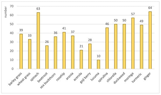 The aim of our work was to compare sixteen commercial nutraceutical powders that are marketed as superfoods, based on their composition, antioxidant capacity, and antimicrobial activity. In addition, the volatile fraction of the products was analyzed, as aromatic volatiles play important role in the biological activity and sensory characteristics of foods [17,18]. For a comprehensive view, we aimed to compare products made from a large variety of raw materials. Our samples included powders of plants traditionally consumed in the Western world (e.g., spinach, rosehip, and ginger powders) and products that are made of raw materials considered exotic in most countries (e.g., goji berry, acerola, and moringa powders). In addition, microalgae and duckweed powders, as alternative nutrient sources, were also investigated.