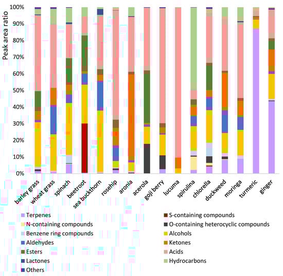 Sulfur-containing volatiles were absent from the vast majority of the samples. However, beetroot powder showed a 29.7% peak area ratio for dimethyl sulfide, which is in accordance with literature data. This compound probably contributes to the pungent odor and flavor of the product, although the distinctive earthy aroma of fresh beetroot is due to the presence of the terpenoid geosmin [61]. Geosmin was not detected in the beetroot powder, likely because it degraded during processing and storage. Nitrogen-containing compounds like pyrazines and acetylimidazole typically occurred in microalgae powders. Pyrazine, 2,5-dimethyl- was present in an exceptionally high peak area ratio of 7.4% in the spirulina powder. Oxygen-containing heterocyclic compounds are widely occurring natural metabolites and can be formed as a result of thermal processing in sugar-rich foods. These components include furans, furanones, and related compounds, which can contribute to the aroma of foods with sweet, baked, and caramel-like notes [62]. Compounds of this chemical class were detected in the headspace of twelve samples. Acerola powder showed an outstanding peak area ratio (14.0%) for 2-furanmethanol, while the greatest variety of oxygen-containing heterocycles was detected in the headspace of goji berry powder. Pyrazines, furan, and furan derivatives are probably formed as a result of thermal treatment. Concerning the benzene-ring compounds, the greatest number of compounds and peak area ratios were detected in spinach, spirulina, and chlorella powders. Frequently detected members of this chemical class were toluene (n = 12) and benzaldehyde (n = 7).