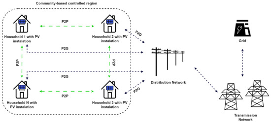 - Long, C.; Wu, J.; Zhang, C.; Thomas, L.; Cheng, M.; Jenkins, N. Peer-to-peer energy trading in a community microgrid. In Proceedings of the 2017 IEEE Power & Energy Society General Meeting, Chicago, IL, USA, 16–20 July 2017; pp. 1–5. [Google Scholar] [CrossRef]
