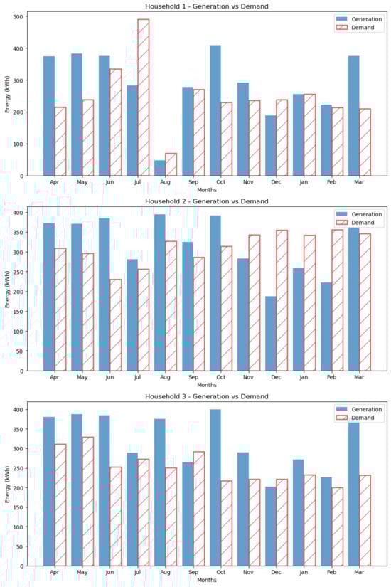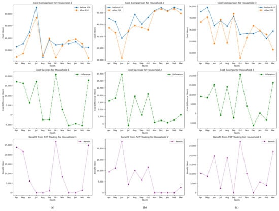 The data also provide an assessment of how P2P affects household electricity cost and value. Figure 2 displays the energy generation and consumption for three households for a twelve-month period. Further, we can see that there exists variation in energy generation and consumption every year in different months. For instance, household 2 shows a high energy generation profile in summer, from the months of June to August, with a small drop in July. However, when it comes to the energy demand, it more or less stays almost constantly the same, with a slight surge in the winter season, that is, from December to February. To assess the economic benefits of P2P energy trading, we compared the costs before and after implementing P2P trading for each household.