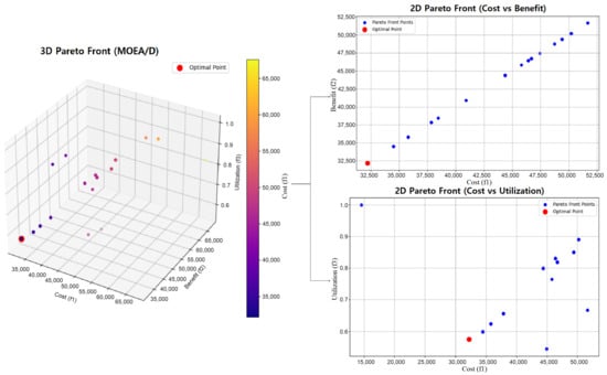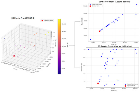 To validate the effectiveness of the proposed MOEA/D-based multi-objective optimization framework, a comparative analysis with the Non-dominated Sorting Genetic Algorithm II (NSGA-II), a widely recognized evolutionary algorithm in multi-objective optimization, is conducted Figure 5. The performance is evaluated based on three objectives: cost minimization, benefit maximization, and energy utilization. NSGA-II results in a cost of KRW 51,754.5, a benefit of KRW 44,853.9, and an energy utilization rate of 49.86%. While NSGA-II produced higher benefit values, MOEA/D demonstrated better performance in cost minimization and energy utilization, highlighting its suitability for applications emphasizing these objectives.