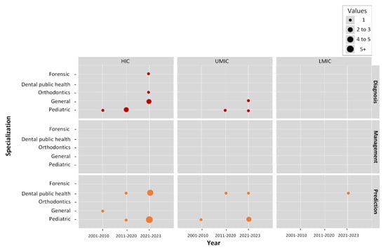 Trends in the use of machine learning (ML) for diagnosis, management, and prediction in dentistry across income groups (HIC: high-income countries, UMIC: upper-middle-income countries, LMIC: lower-middle-income countries) from 2001–2023. The size of the circles represents the number of studies, while the colors indicate the type of application: red for diagnosis and orange for prediction. Notably, high-income countries show a greater and consistent use of ML for diagnosis and prediction, particularly in recent years (2021–2023). Upper- and lower-middle-income countries exhibit increasing but less consistent adoption, with a focus on prediction in LMICs. This highlights disparities in the adoption of ML technologies across economic regions.