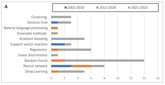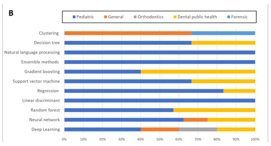 (A) Use of different ML algorithms over time. (B) Use of different ML algorithms according to dental specialties.
