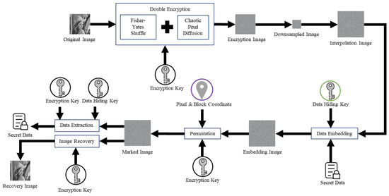 Since finding extra hiding space in encrypted images is challenging due to maximum entropy, some methods [22,23] use interpolation to determine whether a pixel is viable for embedding. In this paper, we propose a high-capacity reversible data-hiding method for encrypted images that enhances privacy protection by employing the Fisher–Yates shuffle algorithm [24] to randomly shuffle pixel sequences. A chaotic sequence diffuses pixels to encrypt the cover image, and interpolation creates space for embedding. In our separate-key strategy, only a receiver with both an encryption key and a data-hiding key can extract secret data and recover the cover image, while a receiver with only the encryption key can only recover the cover image. The method aims to maximize hiding capacity while preserving image integrity and confidentiality.