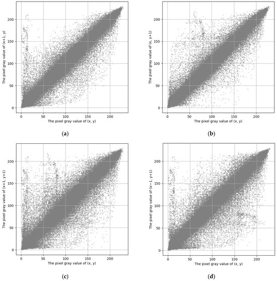 The pixel correlation of the original image ‘Peppers’: (a) horizontal direction; (b) vertical direction; (c) diagonal direction; (d) anti-diagonal direction.