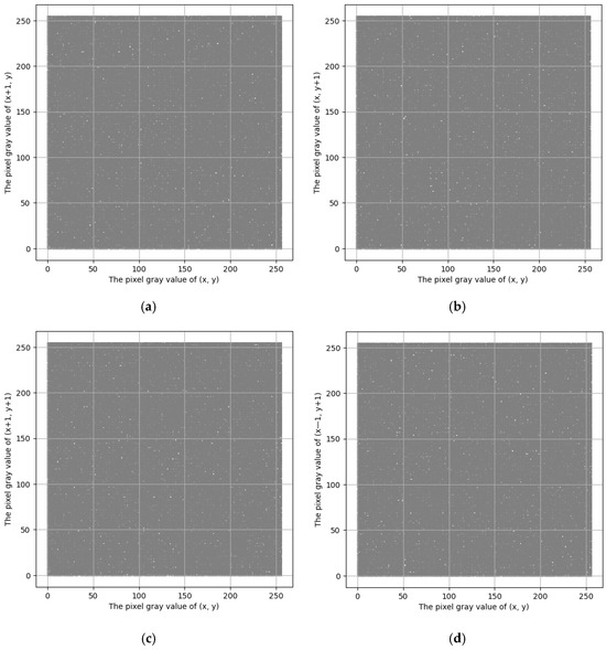 The results presented in Figure 6 indicate that the neighboring pixels in the four directions of the original image are linearly correlated, reflecting the characteristic that adjacent pixels show a strong linear correlation. In contrast, the neighboring pixels in the four directions of the encrypted image, shown in Figure 7, are distributed more uniformly across the coordinate system. The findings in Figure 6 and Figure 7 confirm that the image encryption operations outlined in Section 2.1 are effective.