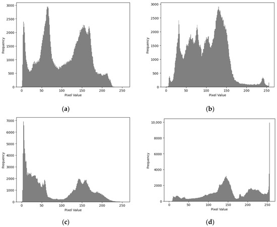 Histogram analysis of the original image: (a) peppers; (b) deer; (c) dance; (d) city.