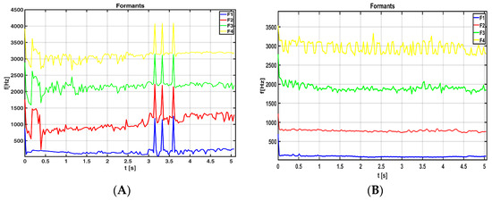Formants reflect the physical characteristics of the sound channel (resonant cavity). Different studies have revealed significant differences in the formant frequencies of different vocalized syllables between PD patients and controls [58,89]. Vowels are formed primarily by movements of the tongue, lips, and jaw, creating oropharyngeal resonating cavities, which amplify certain frequency bands of the voice spectrum. These harmonics are called “formants” [60]. The position of the articulators therefore defines the three-dimensional characteristics of the vocal tractus and influences the formant frequencies [59]. Since formants reflect, to some extent, the position of the tongue, a reduction in the articulation extension of this articulator can subsequently affect the frequency range of the formants. The formant location within the frequency axis is closely related to vocal tract resonant frequency values and depends on its shape. The mid-frequency of each formant is different and closely associated with the vocal tract shape. It depends both on the uttered vowel and the individual traits of the speaker. The frequency of the F1 formant is affected by the position of the tongue in the oral cavity. The formant value F2 is determined by the forward–backward movement of the tongue. The F3 and higher formants depend mainly on the length of the vocal tract, while their resonant frequencies change slightly when uttering various vowels [80,90]. Figure 4 shows the contour of the formants corresponding to patients with PD and healthy subjects. It should be emphasized that diagnostic information can only be sought when analyzing the stability of changes in selected formants and not their sole values, for which, according to claims in the literature, there is a relatively wide frequency range. Please note that the position of the formants on the frequency axis is closely related to vocal tract resonant frequency values and depends on its shape. The mid-frequency of each formant is also closely associated with the vocal tract shape. The waveforms of the formant variability in F1 and F2 demonstrate a significant difference between healthy and PD patients. The waveform for a physiological voice is almost stabilized and has a roughly similar nature to a linear waveform, while when values for a pathological voice do not assume constancy, it is characterized by high variability. Considerable changes for the range of both voices can be observed for the F3 and F4 formants. Less distinctive “formant” generation is cause by the reduced range of articulator movements in PD, leading to impaired vowel articulation. The change in the position of the tongue and the characteristics of the cavity will affect the frequencies of formants [89].