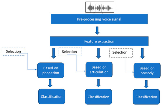 Characteristic voice changes experienced by ca. 70 to 90% of patients already at early stages of the disease are usually of variable nature [32]. Parts of the vocal cords affected by PD include phonation, prosody, and articulation. Numerous tests and experiments have been conducted over the years that allow a synthetic analysis of voice change in a person with PD [9]. For the first time, the pathomechanism of speech disorders in PD was described by Darley et al. [33]. They identified characteristic features of speech in PD, such as decreased speech volume, monotony, disturbances in the pitch and volume of speech, reductions in stress and breathing, hoarseness, inaccurate articulation, and acceleration of the pace of speech. The first articulation and breathing studies were performed in 1970. As a result, the presence of hoarseness, voice roughness, and breathing disorders was observed in 89 patients. Moreover, 25% of the 200 patients experienced problems with producing the sounds “p”, “b”, “s”, “f”, “š”, and “ž” [34]. In the case of patients with PD, speech disorders include dysarthria, aprosody and dysprosody (monotonous speech, no modulation, rhythm, and stress disturbance) [35], paraphasia (using words, syllables or sounds of similar sounding instead of proper ones) [36], breathy and harsh sonority, differences in contrastive stress, shorter phrases, increased length of pauses and hesitations (so-called reflection moans), and a variable speed of speech, including bradylalia (slowing down speech) [37]. Stiffness in the mandible and lip area is also observed. Furthermore, palilalia, which is an involuntary repetition of the same word, may also appear [38,39]. In this context, the literature shows a very large number of studies and approaches aimed at assessing the impact of PD on the voice of patients. Particular intensity in this aspect has been noticed since 2010. In general, these studies can be divided into three main groups depending on the aspect of speech being analyzed, i.e., phonational, articulatory, and prosodic [39]. Since then, a plethora of studies have presented evidence that the neurodegenerative processes associated with PD cause dysphonia and dysarthria, particularly hypokinetic dysarthria [40,41,42,43], in different stages of the disease [44]. Dysphonia can be defined as the speaker’s incapacity to produce a normal phonation due to the phonatory system’s impaired functioning, while dysarthria is more related to problems with articulation when pronouncing words.