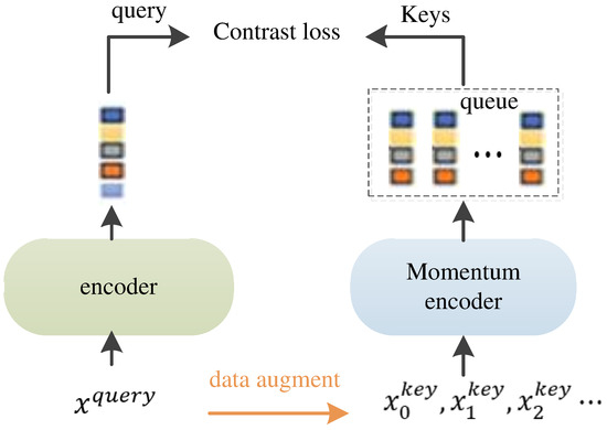 where q denotes the query representation, represents a related key, and denotes the dissimilar keys, with τ being a temperature hyper-parameter. The loss function in question encourages the model to exhibit a significant level of resemblance between the depictions of positive pairs, while simultaneously maintaining a greater degree of dissimilarity between those of negative pairs [33]. Negative keys are queued in MoCo, whereas queries and positive keys are re-encoded in each training batch. A momentum encoder improves representation coherence between current and prior keys, allowing MoCo to divorce the learning process from batch size and negative sample number.