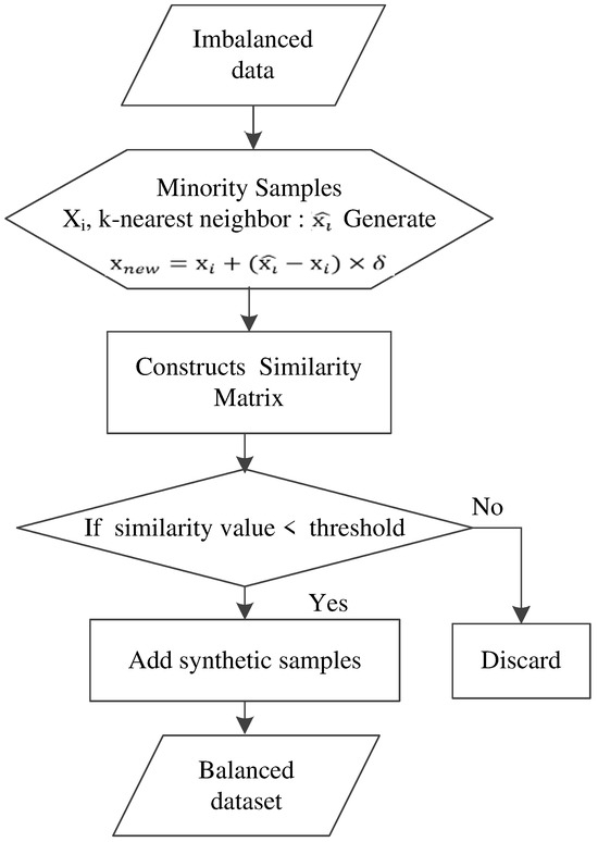 SMOTE-RSB [22] employs the lower approximation principle of Rough Set Theory (RST) to filter out noisy data points in synthetic samples generated by the SMOTE algorithm. The process and logic behind SMOTE-RSB are detailed in the flowchart presented in Figure 2. First, minority class samples are identified from the unbalanced dataset, and new samples are created by interpolating between the minority class samples and their neighbors. Then, a similarity matrix is constructed for the newly generated samples, and the similarity values in the matrix are evaluated according to the lower approximation in RST. If the similarity value is below the lower approximation, the synthetic sample adds new information or changes to the dataset, so it is added to the dataset. Otherwise, the sample is considered too similar to the existing samples and is discarded.