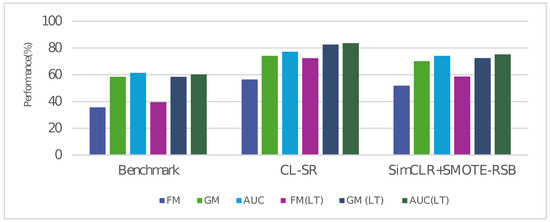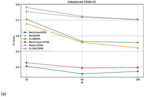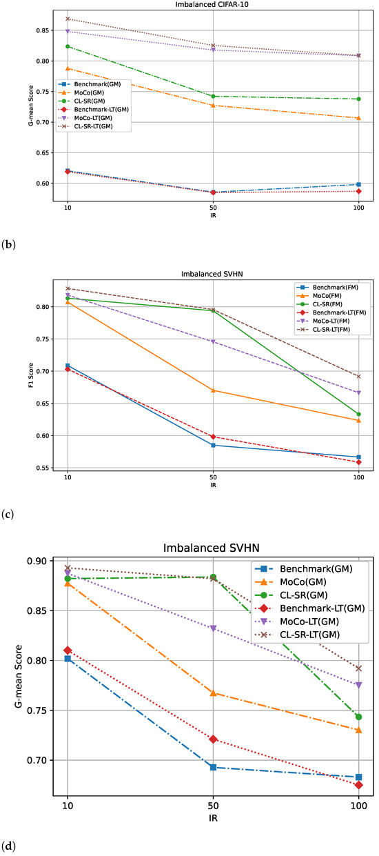 The analysis in Figure 5 highlights that CL-SR outperforms both the Benchmark and MoCo methods across all tested imbalance ratios. Specifically, as illustrated in Figure 5a,b, the FM and GM scores for CL-SR are approximately 20% higher than those for the benchmark in the case of CIFAR-10 with step imbalance. Under long-tailed imbalance conditions, these scores increase by nearly 35%. For the SVHN dataset, as shown in Figure 5c,d, CL-SR consistently surpasses the Benchmark by 10% to 15% margins. Additionally, CL-SR’s FM and GM scores on CIFAR-10 are 4% higher than those achieved by MoCo, and on the SVHN dataset, CL-SR shows a 1% advantage.