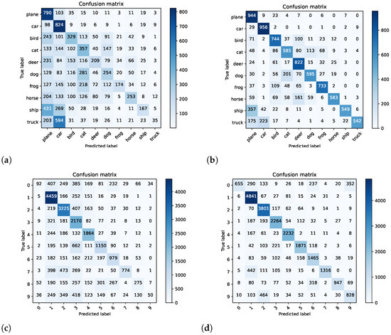 Confusion matrix obtained with IR = 50. (a) Benchmark in CIFAR-10-LT, (b) CL-SR in CIFAR-10-LT, (c) Benchmark in SVHN-LT, (d) CL-SR in SVHN-LT.