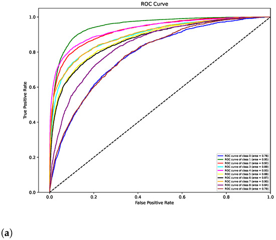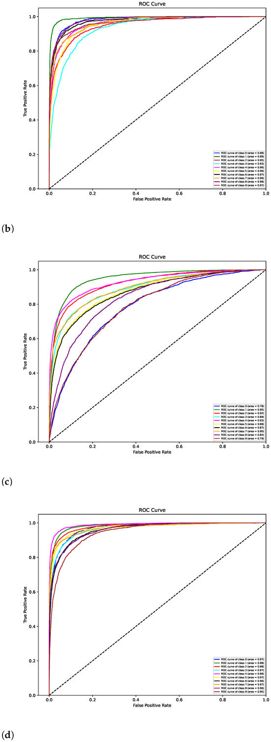 Figure 6 contains four confusion matrix comparing the classification results on the benchmark with applying the CL-SMOTE. The rows are genuine classes and the columns are anticipated classes. Each cell value displays the quantity of instances from the predicted true class, which is the class that the column represents. Color depth represents the number of predictions, ranging from light to dark. Figure 6b shows improved classification accuracy with fewer off-diagonal entries, indicating fewer misclassifications compared to Figure 6a. Similar to Figure 6c, Figure 6d has strong diagonal entries indicative of high accuracy. The multi-class ROC curve is shown in Figure 7. The lines in Figure 7b,d are closer to the left and top edges of the plot than they are in Figure 7a,c, indicating higher true positive rates and lower false positive rates. This shows that CL-SR is better than the benchmark in the multi-class ROC AUC metric. These curves provide a visual assessment of classifier performance, emphasizing the efficacy of the CL-SR approach in handling class imbalances in training datasets.