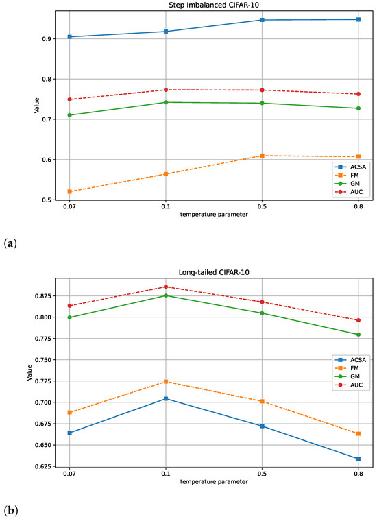 Effect of temperature parameter with IR = 50 on the CIFAR-10 dataset. (a) CIFAR-10-STEP, (b) CIFAR-10-LT.