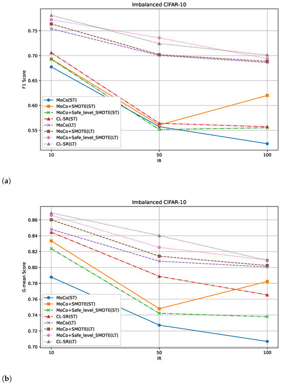 Different oversampling methods with IR = 50 on the CIFAR-10 dataset. (a) F1 score. (b) G-mean score.