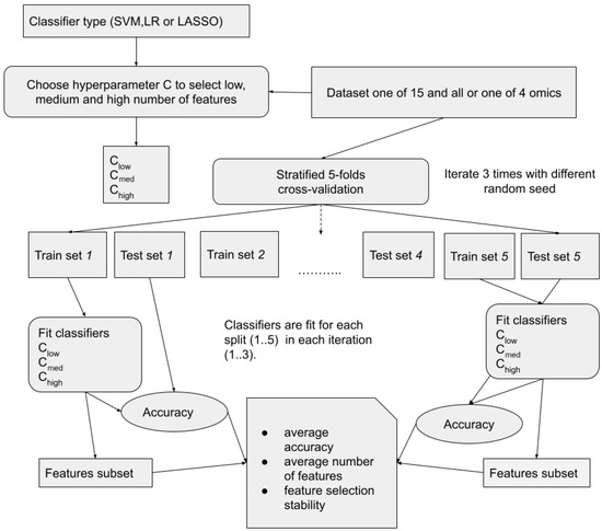 Experimental setup. For each omics layer and all omics, 5-fold stratified cross-validation was repeated 3 times. Each of 3 classifiers was trained using three different C values (, and ). For each classifier, both feature selection stability and accuracy were calculated.