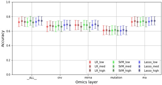 Among the classifiers evaluated, the SVM model exhibited the highest overall accuracy at the med range of C with an accuracy of 0.743, while the weakest performance was observed for the mutation layer in the high range, with an accuracy of 0.605. The LR model exhibited slightly lower accuracy compared to SVM. However, similar to SVM, its best performances (0.739 and 0.738) were achieved in the med range. The achieved peak accuracies of 0.745 in the med range for the overall dataset and 0.743 for the rna omics layer, highlighting its effectiveness in this configuration. It is also worth noting that the differences in classification accuracy across classifier types (SVM, LR, Lasso) in corresponding configurations are minimal.