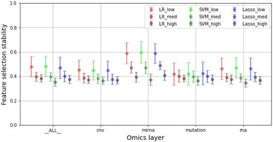 Among the classifiers evaluated, the SVM demonstrated varying stability, with the highest stability for the mirna layer at the low C range, achieving a value of 0.597. However, stability decreased significantly in the high C range, with an overall stability score of only 0.353, indicating reduced reliability in feature selection. The LR exhibited consistent performance, particularly at the low C range, where the stability for the mirna layer reached 0.590. Stability values for LR were generally lower in the med and high ranges, reflecting a consistent but less robust feature selection across the parameter spectrum. The Lasso regression also showed strong stability at the low C range, with the highest value of 0.589 for the mirna layer. However, similar to the other methods, stability diminished in the higher parameter ranges, especially noted with a score of 0.366 for the rna layer in the high range. Overall, the low C range consistently yielded better feature-selection stability across all classifiers, highlighting the trade-off between model complexity and stability in multi-omics data analysis.