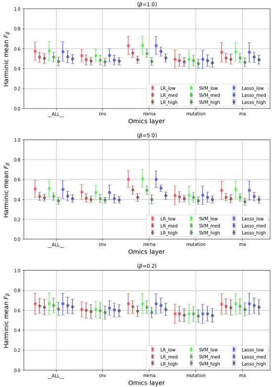 Among the classifiers, the LR achieved the highest overall weighted harmonic mean in the low C range, with a value of 0.575, indicating strong performance in both classification accuracy and feature-selection stability. The best stability was recorded for the mirna layer, reaching 0.632, which highlights the robustness of LR in this context. The SVM also performed well in the low C range, with a weighted harmonic mean of 0.578, demonstrating solid classification accuracy, particularly for the mirna layer at 0.637. However, performance decreased in the med and high ranges, suggesting that increasing model complexity adversely affects the balance between accuracy and stability. The Lasso regression exhibited similar trends, with the best overall performance in the low C range at 0.570 and notable stability for the mirna layer at 0.632. As with the other methods, a decline in performance was observed as C increased, particularly evident in the high C range, where Lasso achieved the lowest score of 0.498. Overall, the results indicate that lower values of C tend to yield better balances between classification accuracy and feature selection stability across all classifiers, emphasizing the importance of model tuning in multi-omics analyses.