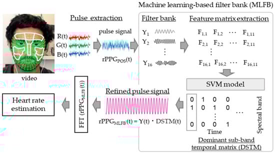 Schematic of the proposed machine learning-based filter bank (MLFB) algorithm. The pulse signal of remote photoplethysmography (rPPGPOS) is derived using the plane-to-orthogonal-skin (POS) algorithm, using the red [R(t)], green [G(t)], and blue [B(t)] components of the video signals. The signal is then processed through a 16-sub-band filter bank, and the feature matrix (F) is computed. A support vector machine (SVM) is employed to generate a dominant sub-band temporal matrix (DSTM), which is used to output the refined pulse signal of rPPGMLFB.