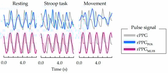 Figure 2 shows an example of rPPG signals computed from facial video data under three conditions (Resting, Stroop task, and Movement) and cPPG (as a reference for heart activity). The upper panel shows the rPPGPOS obtained in a previous study using only the POS algorithm, and the lower panel shows the rPPGMLFB obtained using the proposed MLFB algorithm. Under resting conditions, both rPPGMLFB and rPPGPOS exhibited morphological patterns similar to those of the reference signal; however, rPPGPOS demonstrated increased noise levels. The extent of signal degradation in rPPGPOS became more pronounced during movement conditions. Nevertheless, rPPGMLFB maintained a strong correspondence with the reference signal, even under movement.