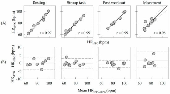 (A) Correlation between heart rate calculated using contact photoplethysmography (HRcPPG) and heart rate extracted from video data using the machine learning-based filter bank algorithm (HRrPPG). (B) Bland–Altman plot comparing the two methods.
