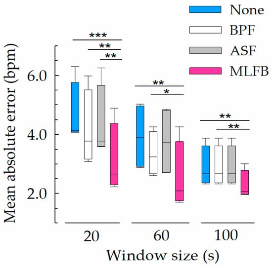 Comparison of the mean absolute error of heart rate retrieved by four different algorithms with three window sizes: no pre-processing (none) in blue, band-pass filter (BPF) in white, amplitude-selective filter (ASF) in gray, and machine learning-based filter bank (MLFB) in pink. Statistically significant difference is denoted by *: p < 0.05, **: p < 0.01, and ***: p < 0.001.