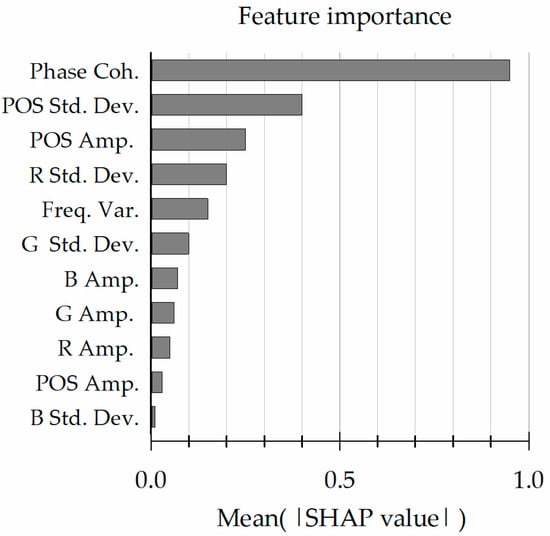 The importance of the 11 features used in the proposed MLFB algorithm model was investigated using the SHapley Additive exPlanations (SHAP) method []. The SHAP values for each feature are shown in Figure 5. As seen, phase coherence was the most important feature, with a value of 95%. The next most important features were the standard deviation and amplitude average of the POS signal, with values of 40% and 25%, respectively.
