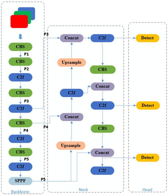 YOLOv8 [] is a highly efficient deep learning model in the field of target detection, which inherits the tradition of YOLO series algorithms and is capable of achieving high accuracy and high-speed target detection. YOLOv8 is based on the CSP (Cross-Stage Partial) structure of YOLOv5 [] in the backbone network, but with optimization of the module design. YOLOv8 has replaced the C3 module in YOLOv5 with the C2f module to further reduce the model size and improve computational efficiency. YOLOv8 replaces the C3 module in YOLOv5 with the C2f module to further reduce the model size and improve computational efficiency. Meanwhile, it adopts the improved Path Aggregation Network (PANet) as the feature fusion module and introduces the CIoU loss function, which effectively improves the accuracy of target frame regression. In addition, YOLOv8 has also optimized the data enhancement and training strategy, which makes the model’s performance more stable under different scales and backgrounds. The model structure of YOLOv8 is shown in Figure 2.