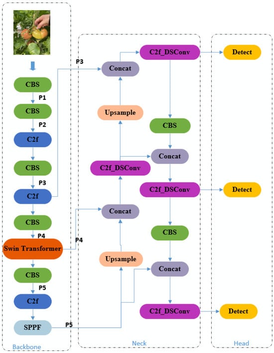 In this study, we made several key improvements to the YOLOv8 model to further enhance its performance in tomato ripeness detection. The structure of the improved model is shown in Figure 3. First, we introduced the Swin Transformer module in the backbone network part of YOLOv8. The core idea of this improvement is to enhance the global modeling capability of features with the help of the transformer mechanism. Especially when dealing with long-range dependencies, the self-attention mechanism of Swin Transformer can capture fine-grained contextual information more effectively. This feature is particularly important in the tomato ripeness detection task, as ripeness judgments are often based on subtle color variations and texture differences on the surface of tomato fruits, and Swin Transformer is able to improve the ability to discriminate between small and similar targets (e.g., tomatoes at different ripeness stages) in the presence of complex light variations and background noise, thus significantly improving the accuracy of ripeness detection.