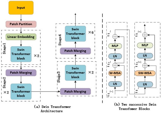 (a) The architecture of a Swin Transformer (Swin-T) []; (b) two successive Swin. W-MSA and SW-MSA are multi-head self attention modules with regular and shifted windowing configurations, respectively, in Transformer Blocks.