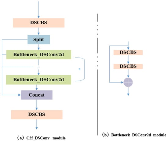 Conventional C2f modules usually consist of ordinary convolutional layers that are fixed to certain spatial position relationships when processing images, and the fixed convolutional kernel may miss some subtle local changes or texture information when applied to different regions of the image. In this study, we propose an improved C2f module, the C2f_DSConv module (shown in Figure 5), to improve the performance of the model in the tomato ripeness detection task. The core innovation of this module is to improve the perception of subtle differences in tomato ripeness by adjusting the spatial properties of the convolution operation so that the model can better capture local and global features in the image. The design concept of the C2f_DSConv module is to introduce Distributed Shift Convolution (DSConv) [] on top of the original C2f module in order to improve the response of the convolutional layer to local variations during the feature extraction process while avoiding the loss or insufficiency of information that standard convolution can introduce when processing complex images. In the tomato ripeness detection task, changes in the appearance of tomatoes are typically gradual and locally dependent, with subtle changes in ripeness including gradual changes in color, textural details of the skin, and small differences in morphology. These changes are often difficult to adequately capture with conventional convolution, and therefore a feature extraction method that can accommodate these detailed changes needs to be developed. By adjusting the convolutional structure in the C2f module, the C2f_DSConv module is able to improve the perception of spatial relationships between different regions in the image while retaining the advantages of the original convolutional operation. This improvement does not rely solely on a simple transformation of the convolution kernel, but by improving the convolution path, the convolution operation allows for a more flexible and accurate perception of spatial relationships.