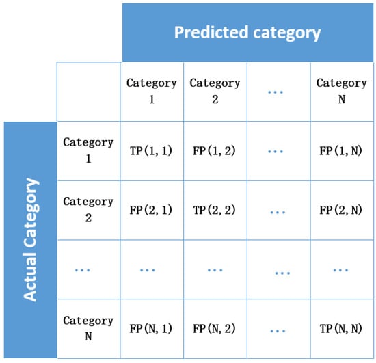It can realistically present the relationship between real categories and predicted categories. In the multi-classification problem, the confusion matrix is a matrix of N × N, whose structure is shown in Figure 6. Each row represents a true category, and each column represents a predicted category. Values on the diagonal represent the number of correctly categorized samples, and values on the off-diagonal represent the number of incorrectly categorized samples.