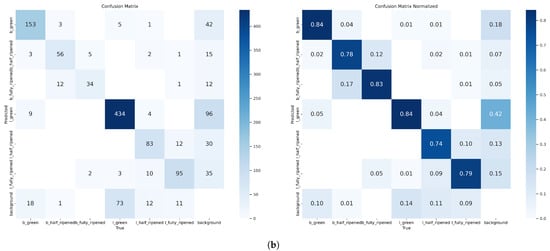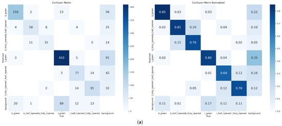 Confusion matrix of YOLOv8s and improved model. The left side of (a) is the confusion matrix detected using YOLOv8s, and the right side is its normalized confusion matrix. The left side of (b) is the confusion matrix detected using the improved model, and the right side is its normalized confusion matrix.