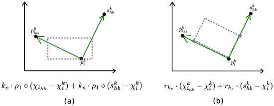 - Cognitive velocity results in a random vector within the region , scaled by .