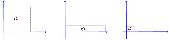 - The term (22b) describes a neighborhood of ; however, the form of such neighborhood depends on (see Figure 6). A neighborhood of having the same size independently of the position of is and a random vector within this neighborhood is given by .